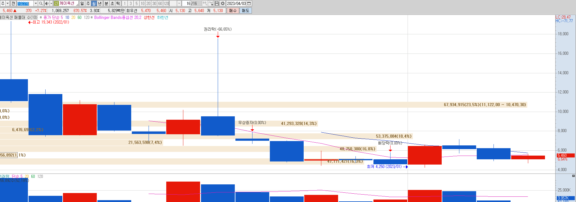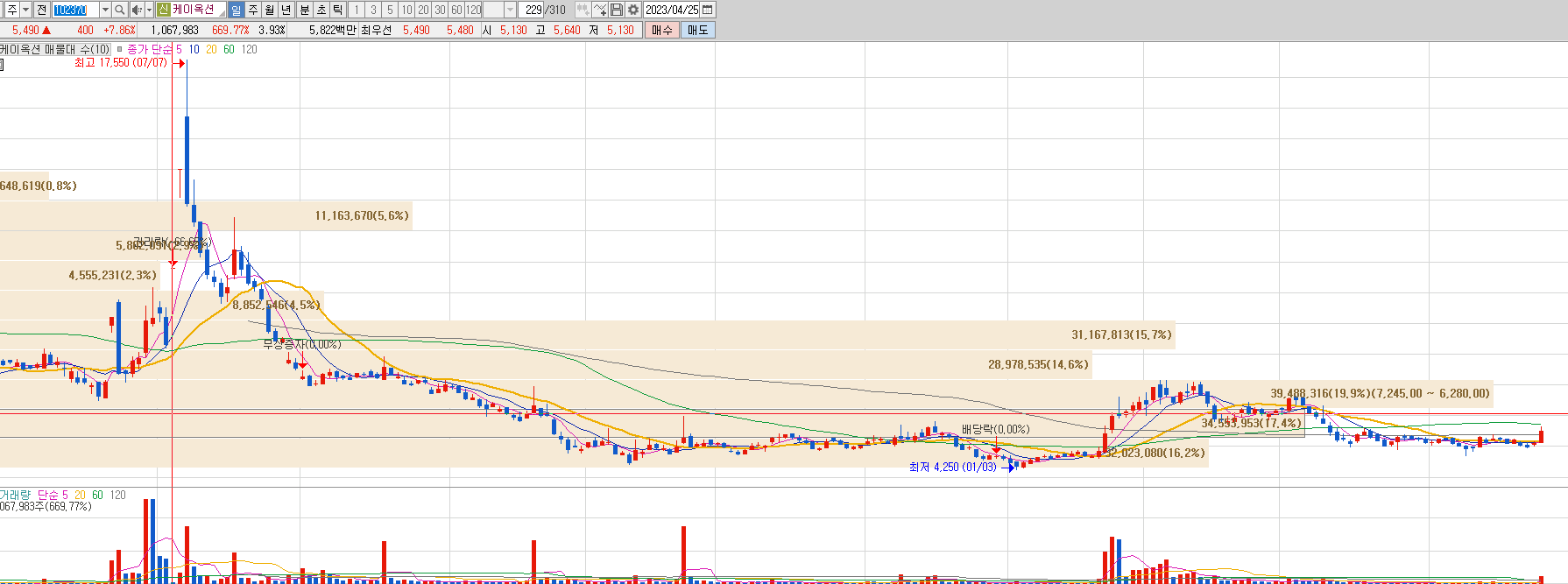 케이옥션 월봉차트이다 매물 때도 적적가격에만 분포되어 있는 걸로 볼 수 있다,